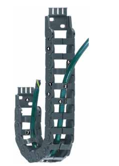 Z 14系列 - 鏈, 從外徑方向 1. 可進(jìn)行扭轉(zhuǎn)運(yùn)動(dòng) 2. 非常易于填充——適合預(yù)裝配插頭的應(yīng)用 3. “按鈕式設(shè)計(jì)”將鏈節(jié)固定在一起 4. 小節(jié)距實(shí)現(xiàn)靜音平穩(wěn)的運(yùn)轉(zhuǎn) 5. 保護(hù)電纜的內(nèi)部空間 6. E型,沿外徑填充 7. Z型,沿內(nèi)徑填充 8. 可選用集成去應(yīng)力元件的安裝架 可提供內(nèi)寬 Bi: 10 - 50 mm 可提供彎曲半徑 R: 28 - 125 mm 螺距: 30,5 mm/鏈節(jié) = 33 鏈節(jié)數(shù)/米